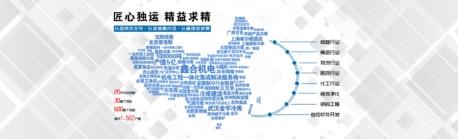 安徽鑫合機(jī)電設(shè)備有限公司于2002年組建運營,專業(yè)從事冷凍、冷藏庫、中央空調(diào)、醫(yī)藥凈化工程的規(guī)劃設(shè)計、施工承建、售后服務(wù)為一體的綜合性工程公司,與100多家實力雄厚的大中型企業(yè)建立長期產(chǎn)略合作關(guān)系,其中有多家世界500強(qiáng)和上市企業(yè)。公司作為中國倉儲與配送協(xié)會會員單位、安徽省制冷學(xué)會理事單位、上海楊浦區(qū)制冷協(xié)會工程總承包負(fù)責(zé)單位,引領(lǐng)于行業(yè)前沿。我們將銘記給予我們大力支持的各界新老朋友及合作伙伴,我們將會保持“互惠互利、共同發(fā)展”的原則與您共創(chuàng)雙嬴的合作關(guān)系。